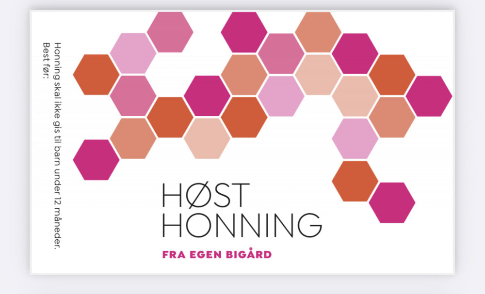 Tekst på etiketten: Høsthonning fra egen bigård. Honning skal ikke gis til barn under 12 måneder.